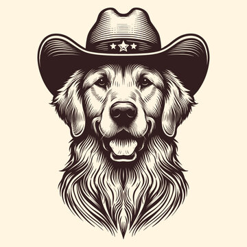 recommend clip art: Portrait Illustration Of A Golden Retriever Wearing A Cowboy Hat In Engraving Style