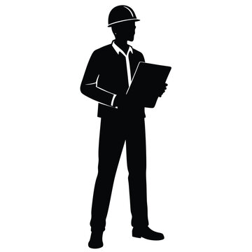 recommend clip art: engineer silhouette profile holding on to helmet visor on white isolated background, male profession concept