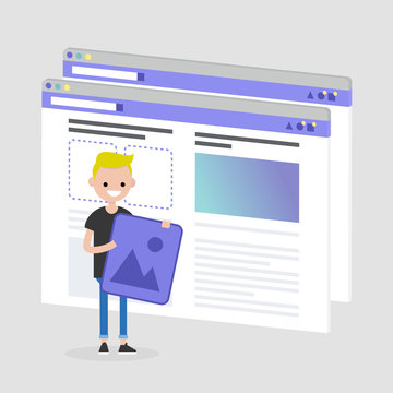 recommend clip art: Young female character holding a smartphone. New technologies. Messenger. Pop up windows. Flat editable vector illustration, clip art