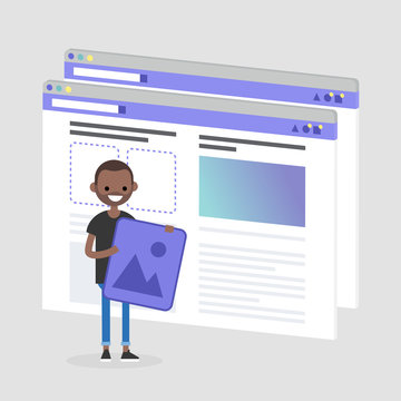 recommend clip art: Young female character making a content for the lifestyle media. Webpage layout. Front end developer. Technology. Flat editable vector illustration, clip art